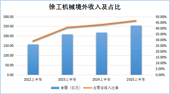 今年上半年,在徐工機(jī)械548.08億元收入中,海外收入255.46億元,同比增長(zhǎng)16.64%,海外收入占比自2022年中報(bào)的29.07%至上年同期的43.17%,進(jìn)一步提升至46.61%,3年來(lái)穩(wěn)步提高。