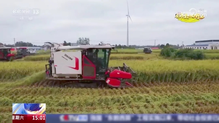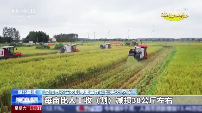 9月20日,中央電視臺(tái)新聞?lì)l道《新聞直播間》“在希望的田野上”欄目將鏡頭對(duì)準(zhǔn)湖北應(yīng)城,報(bào)道了八臺(tái)徐工XR720履帶式谷物聯(lián)合收獲機(jī)在當(dāng)?shù)亻_展大規(guī)模糯稻收割的豐收盛景——履帶滾滾,金黃的稻穗迅速被吞入機(jī)器,頃刻間完成收割、脫粒、清選等一系列作業(yè),顆顆飽滿的籽粒穩(wěn)穩(wěn)落入糧倉。