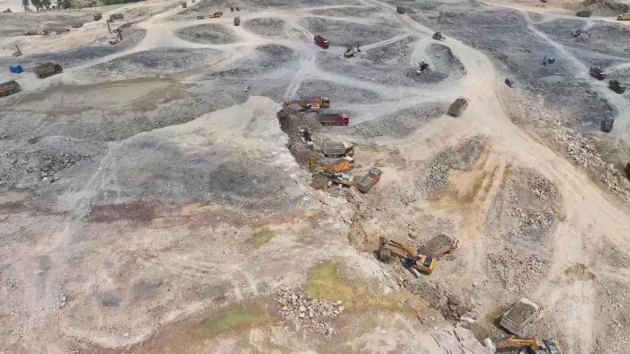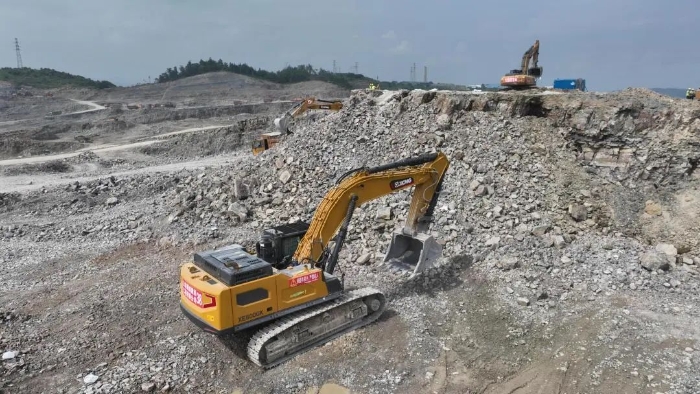 前期爆破剝離工序后,徐工20噸挖掘機搭配140的小破碎錘進行二破,同時XE380GK、XE600GK等機型進行挖裝作業(yè)。現(xiàn)場共投入挖掘機50多臺,每天的挖方量在10萬方左右。