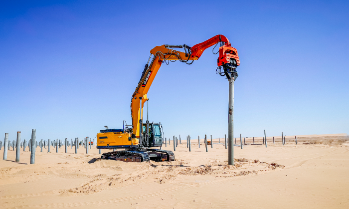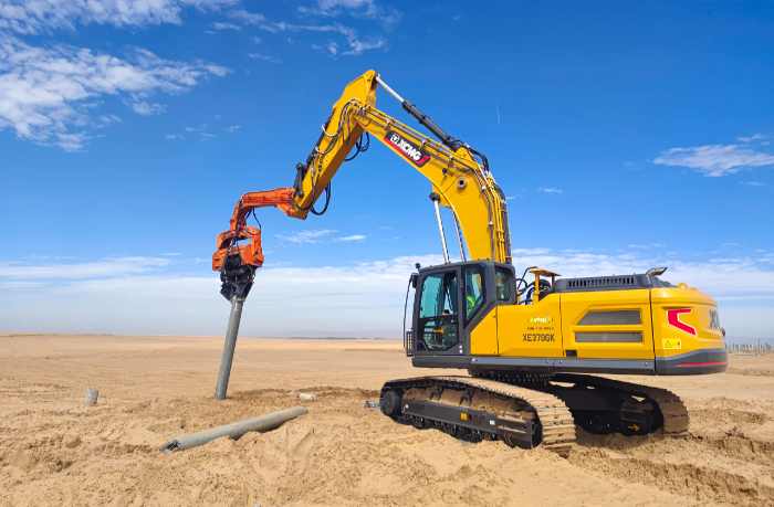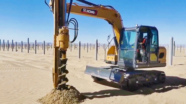 此次徐工挖掘機參建的巴彥淖爾100萬千瓦光儲+生態(tài)治理項目位于內(nèi)蒙古西部,是自治區(qū)年度重點工程,對當(dāng)?shù)刭Y源開發(fā)和綠色發(fā)展具有重要意義。 與以往常規(guī)項目不同,此次徐工挖掘機主要擔(dān)任光伏樁的鋪設(shè)工作,通過改裝振動錘和引孔機等多功能屬具,有效滿足現(xiàn)場多元化施工需求。