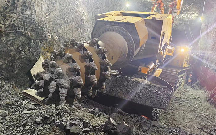 該礦施工斷面5m*4.5m,巖層硬度在60MPa左右,客戶所選購的徐工XTR7/360掘進(jìn)機(jī)最大截割高度7.2m,可實(shí)現(xiàn)中等斷面隧道一次開挖成型,切割頭配合硬巖截齒,掘進(jìn)時(shí)可以向巖壁施加每平方厘米1.5噸的力量,在機(jī)動(dòng)靈活的基礎(chǔ)上兼具掘進(jìn)硬巖的優(yōu)勢。
