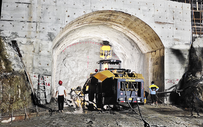 2號(hào)引水洞最先進(jìn)行鑿巖臺(tái)車(chē)施工,該段項(xiàng)目為Ⅱ類(lèi)—Ⅲ類(lèi)巖層,其中Ⅱ類(lèi)巖層較多,科學(xué)組織、合理安排,緊盯關(guān)鍵工序的管理與施工,在保證安全和質(zhì)量的前提下極大提高了施工效率,破解了硬巖施工等難題,徐工鑿巖臺(tái)車(chē)單日進(jìn)尺12米左右。