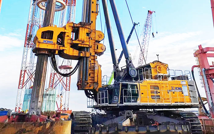 徐工XR1600E旋挖鉆機(jī)參建項(xiàng)目為世界上跨度最大的西堠門公鐵兩用跨海大橋,其中5號(hào)主塔墩基礎(chǔ)采用18根6.3m鉆孔灌注樁進(jìn)行承載。XR1600E旋挖鉆機(jī)需要在大風(fēng)、激流、裸巖、深水的復(fù)雜海洋環(huán)境下為這座超級(jí)跨海大橋進(jìn)行夯基,完成目前國(guó)內(nèi)最大直徑6.3m的鉆孔施工!