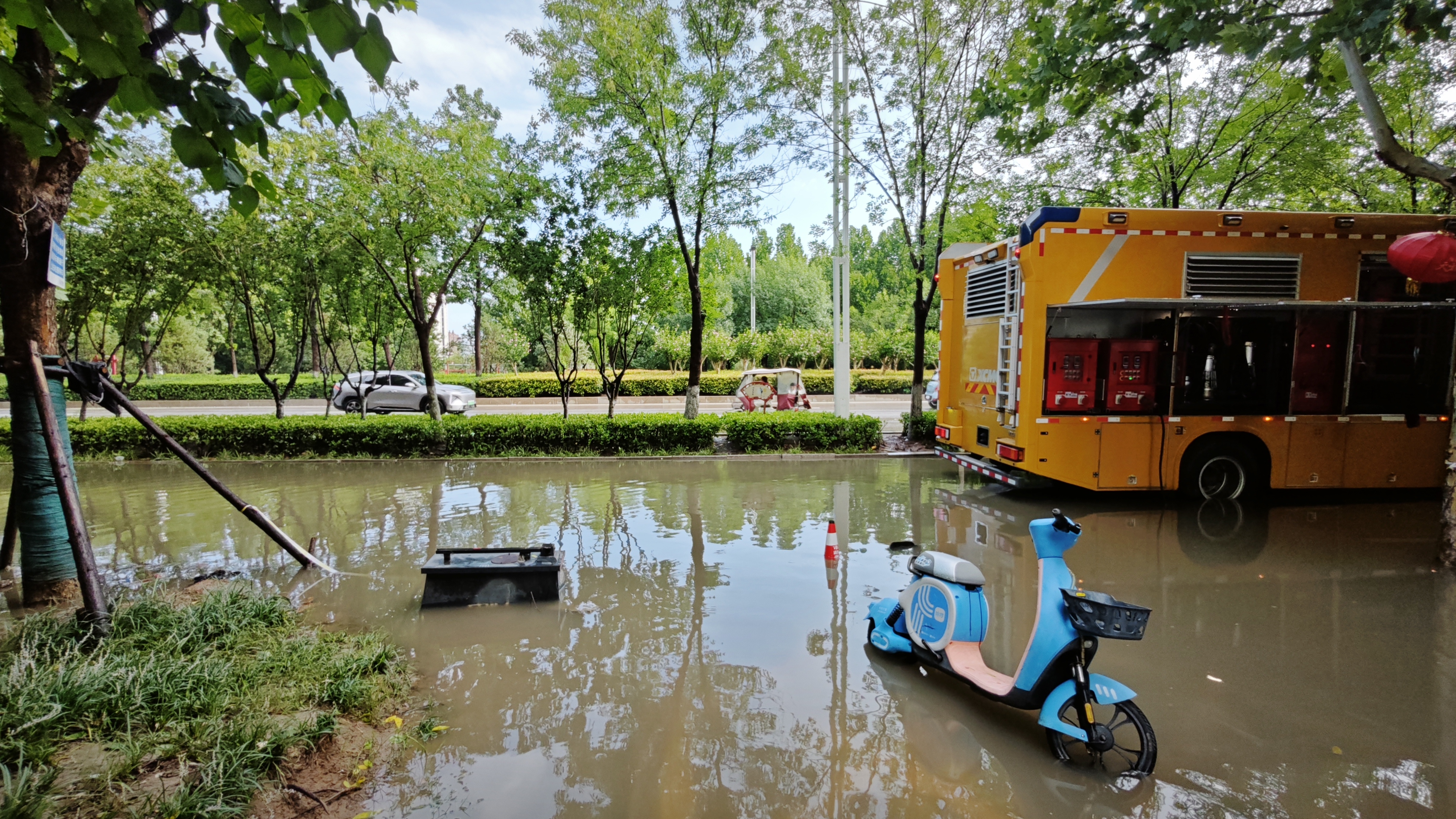 華商大道同屬商丘市睢陽區(qū),此處靠近河堤,周邊道路積水均向此處轉(zhuǎn)移,交通主干道被積水淹沒,影響城市正常通行。