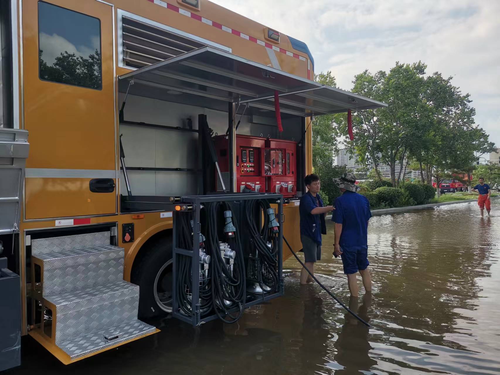 到達(dá)現(xiàn)場后,徐工救援人員立即研判積水情況,商議作業(yè)方案。由于排水距離過長,最終確定啟用1個泵連接120米水帶,將水泵放入下水道中抽排水。連續(xù)作業(yè)15小時后,PS40B累計排水約8000立方,根據(jù)消防隊指揮趕往下一場地。