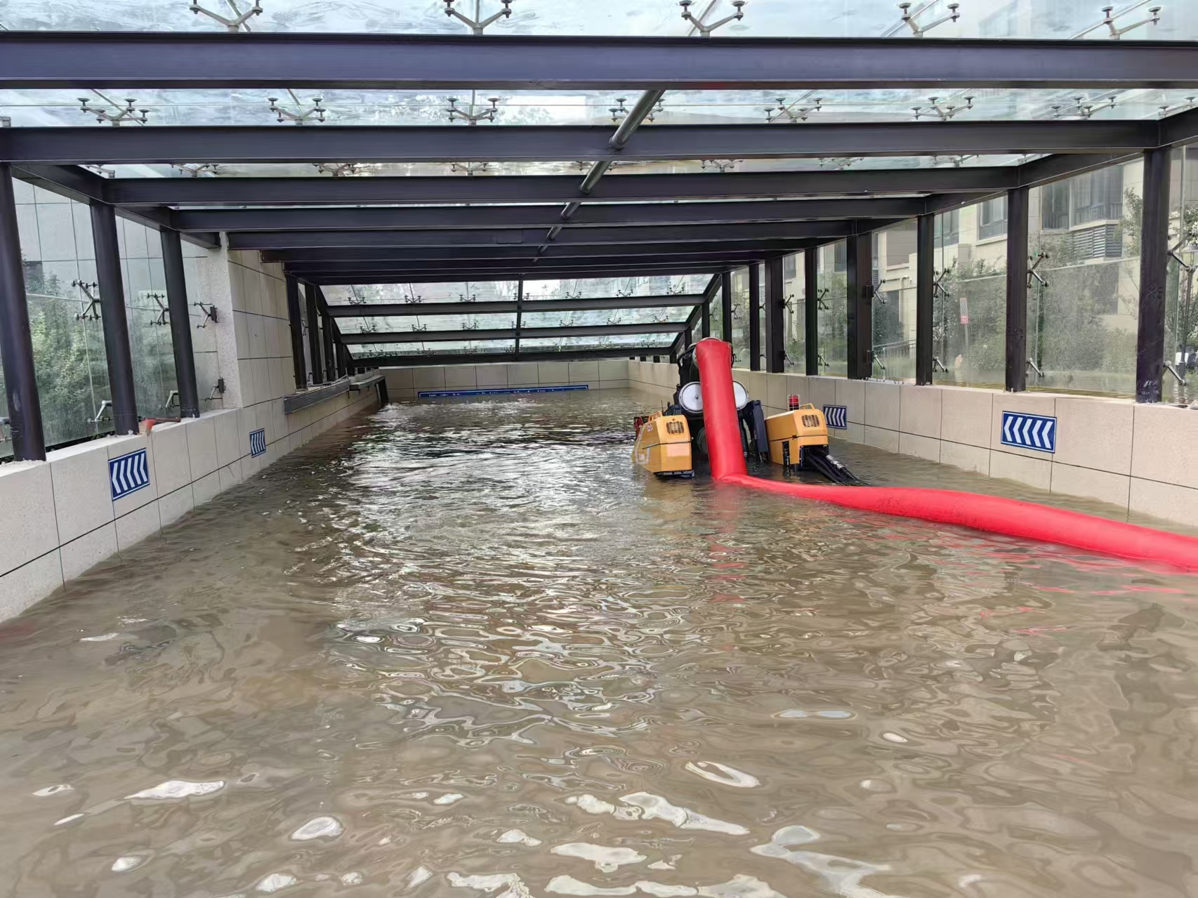 閩泰小區(qū)位于蕭縣龍河街道交通東路,暴雨導(dǎo)致小區(qū)變身“水簾洞”,路面積水已沒人員小腿,迎街地下車庫積水倒灌,出入口已被完全淹沒,近百臺(tái)車輛無法轉(zhuǎn)移,受損嚴(yán)重。由于車庫平均寬度僅2.5m,大型救援車輛進(jìn)出受阻,緊急之際,徐工調(diào)派PS50F子母式排澇車趕往支援。