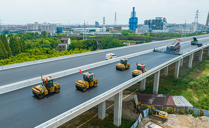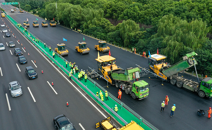 常泰長江大橋大寬度整幅面層的“一鍵鋪平”,也備受矚目。進行此次攤鋪工作的是徐工自主研發(fā)的大米數(shù)攤鋪機和13噸雙鋼輪壓路機,攤鋪寬度15m,厚度4cm,屬于大寬度的整幅面層攤鋪,實現(xiàn)施工效率、橋面平整度雙提升。鋪裝工程涵蓋了橋面、主路、匝道等多個施工場景,充分體現(xiàn)出徐工設備的廣泛適用性和靈活性。無論是寬闊的主橋面,還是復雜的匝道區(qū)域,都能實現(xiàn)高質量的整幅面層攤鋪。