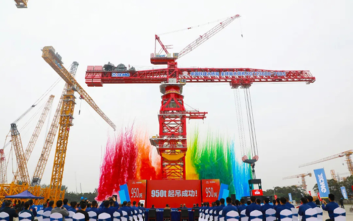 儀式現(xiàn)場,全球最大塔機XGT23000-760S順利完成1.25倍動載起吊,吊裝重量達到950噸。