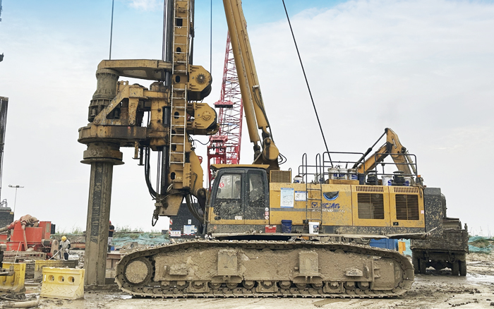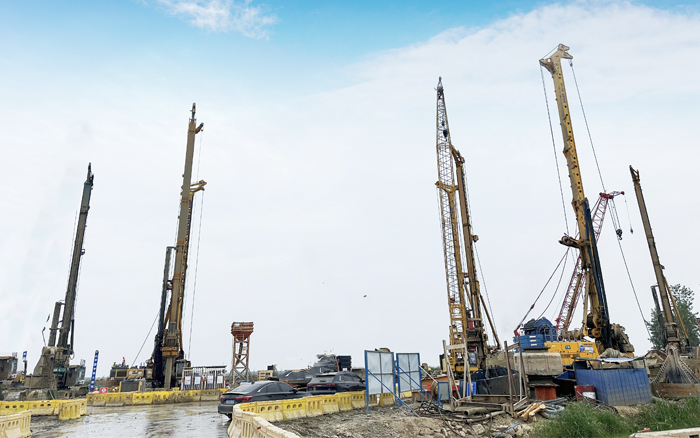 徐工XR550D、XR580HD等多臺(tái)徐工大噸位旋挖鉆機(jī)群憑借精湛的技術(shù)和卓越的性能,成功攻克了地層復(fù)雜、工期緊迫等多重難題,平均成孔周期68小時(shí),全面提速大橋樁基礎(chǔ)建設(shè)。