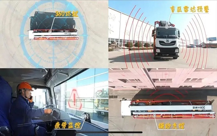 車(chē)身同時(shí)配有盲區(qū)雷達(dá)預(yù)警、360環(huán)視等輔助駕駛系統(tǒng),提升泵車(chē)駕駛安全系數(shù),行車(chē)更安心。