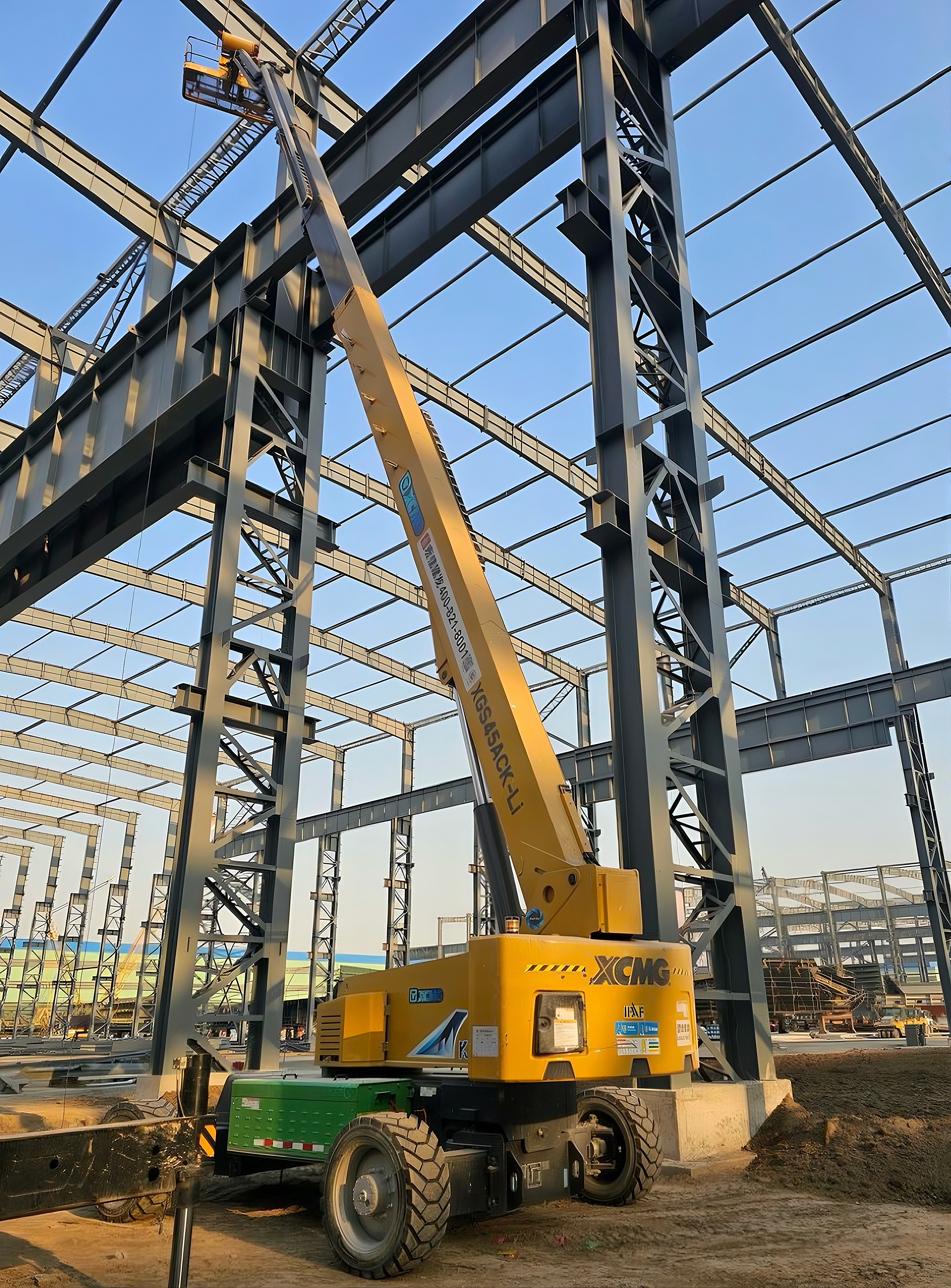 面對車間跨度大、作業(yè)面復雜等難題,兩臺產(chǎn)品展現(xiàn)超長臂展,精準覆蓋高空盲區(qū),攻克了廠房鋼結構焊接、頂棚管線鋪設等高難度施工挑戰(zhàn);低半徑轉彎的特性使車輛在廠房通道靈活穿梭,智能安全系統(tǒng)全程“護航”,大幅提高了施工作業(yè)效率。現(xiàn)場作業(yè)人員紛紛點贊:“電動化+高米數(shù)的組合,完美匹配智能化車間綠色、高效的施工需求!”