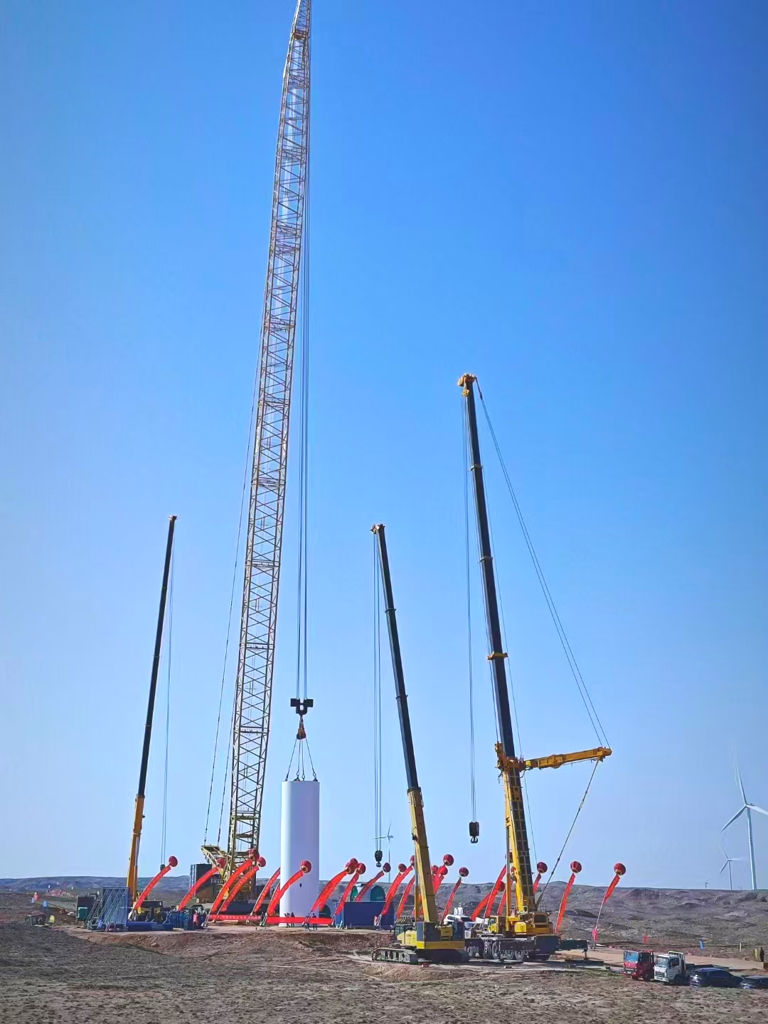 隨著施工號角吹響,各臺起重機緊密配合,XLC18000M采用138+8m的標(biāo)準(zhǔn)風(fēng)電工況,穩(wěn)穩(wěn)將98m長的葉片與112t重的輪轂、葉片在百米高空精確連接到機艙,XGTC160-I、XCA600L8 和 XCA200L8_2則靈活調(diào)整位置,輔助完成關(guān)鍵部件的吊裝,整個吊裝過程精確無誤。