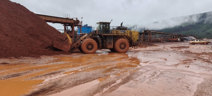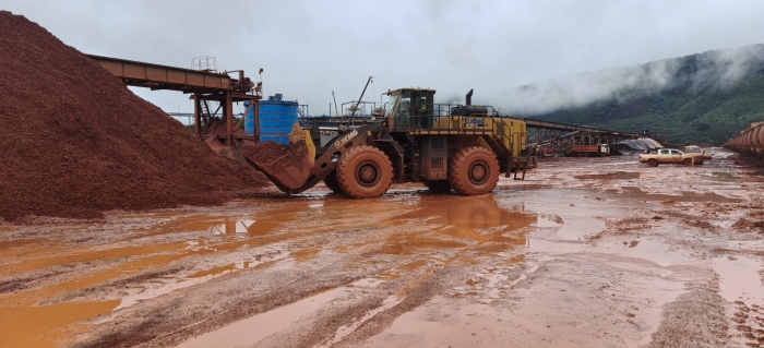 非洲某礦區(qū),徐工LW1200KN輪式裝載機(jī)正對(duì)開(kāi)采出的礦粉進(jìn)行堆垛作業(yè),恰逢雨季,物料飽含水分,LW1200KN的超強(qiáng)重載性能得到充分展現(xiàn)。