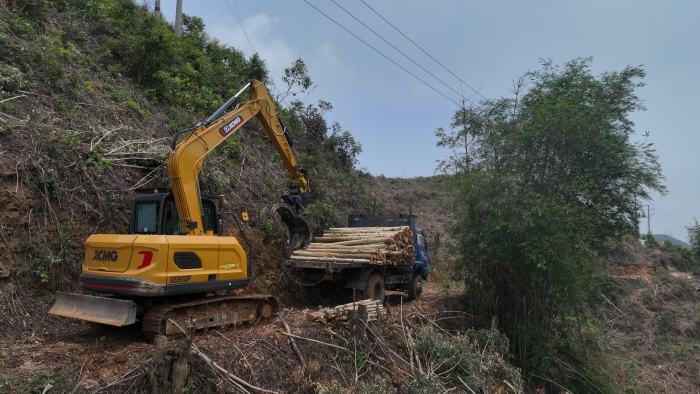在鄭俊負(fù)責(zé)的林場,每節(jié)木材長度2.6米,徐工XE85GF一次可以夾10節(jié)以上的木材,重量超過1噸,而之前的輪挖夾裝0.6噸木材已是極限。