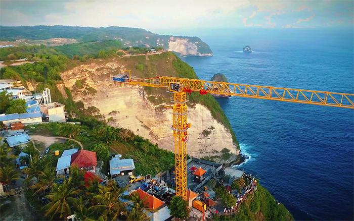 碧藍(lán)海灣、潔白沙灘,在旅游勝地印尼巴厘島,徐工XGT360-20S1屹立在懸崖峭壁之上,眺望懸崖海景和奇特的海岸線景觀,為巴厘島佩尼達(dá)精靈海灘觀光電梯項(xiàng)目注入徐工“動力”。