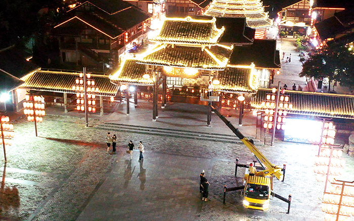 在以 “非遺傳承” 為定位的廣西某文旅小鎮(zhèn)亮化工程中,徐工 C 系列 GKS28 高空作業(yè)車憑借出色性能,成為施工關(guān)鍵力量。
