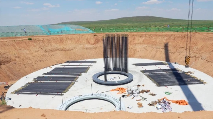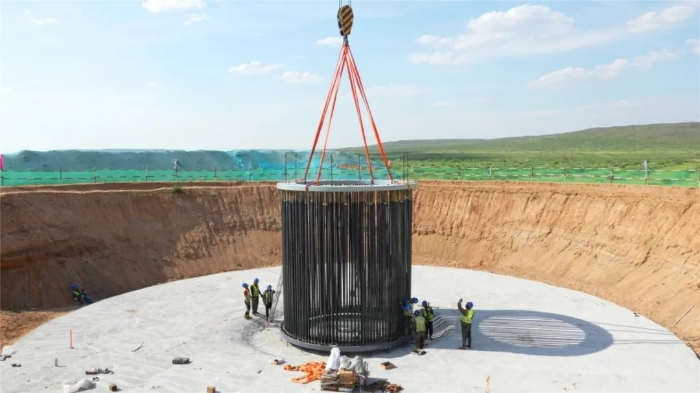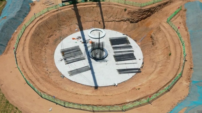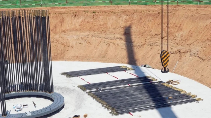 此次進(jìn)行的是風(fēng)電基礎(chǔ)吊裝,重達(dá)17噸的鉚盤穩(wěn)落在基坑,214根鉚桿密集插裝,每一根都必須精準(zhǔn)插入孔位。