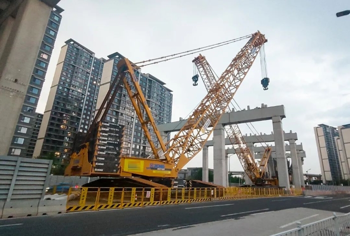 面對有限的操作空間,兩臺徐工XGC11000(650噸級)履帶起重機(jī)采用42米標(biāo)準(zhǔn)主臂工況,分別精準(zhǔn)定位在梁體兩側(cè)狹窄區(qū)域內(nèi),將重達(dá)60噸的預(yù)制混凝土預(yù)制梁,穩(wěn)穩(wěn)吊離運(yùn)梁車,梁體全程保持水平“懸浮”。