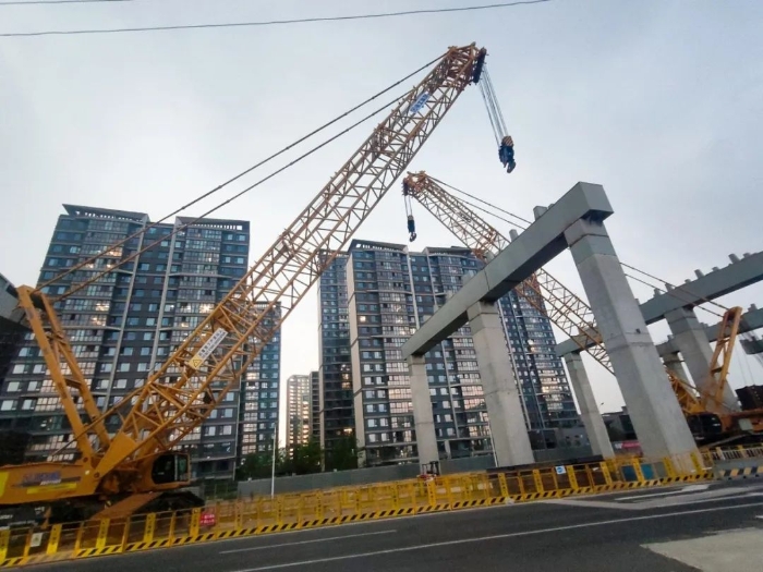 狹窄空間內(nèi),兩機(jī)協(xié)同微調(diào),在進(jìn)行精確轉(zhuǎn)場移動(dòng)的同時(shí),也避免了任何晃動(dòng)或扭轉(zhuǎn),重物分毫不差地平穩(wěn)落位至預(yù)定橋墩支座上,整個(gè)過程高效流暢,一氣呵成。