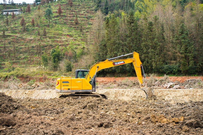 洪雅向東90公里,是仁壽縣,作為四川省產(chǎn)糧大縣,仁壽曾因田塊細碎導(dǎo)致機械化率不足。在5000畝的高標準農(nóng)田建設(shè)中,項目方集結(jié)18臺徐工挖掘機,以“日均30多畝”的速度搶抓工期。