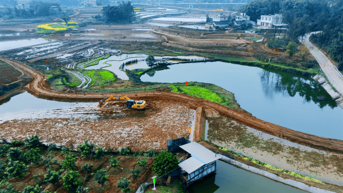 繼續(xù)向東,這里是萬里長江第一城——宜賓,在宜賓江安縣陽春鎮(zhèn),5000畝高標準農(nóng)田建設(shè)進入尾聲,項目高峰期投入30余臺徐工挖掘機。