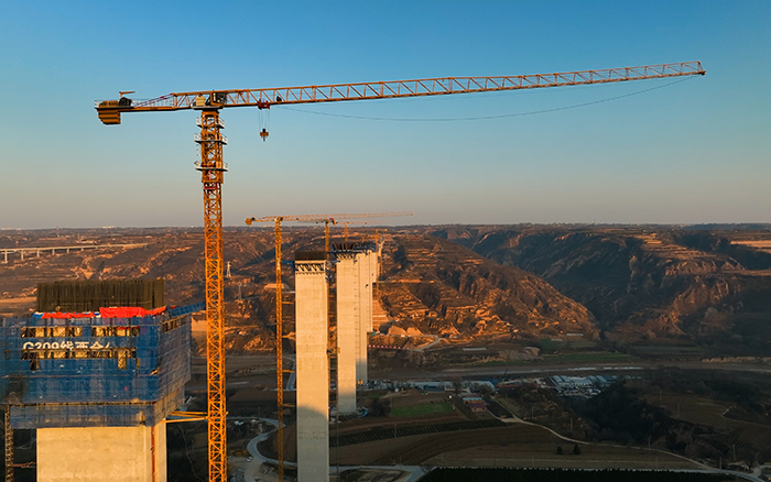 在廣袤的隴東地區(qū),穿過層層大霧,俯瞰馬蓮河特大橋項(xiàng)目,徐工群塔似根根“擎天柱”矗立在黃土高原上。