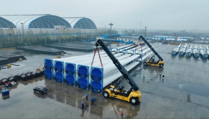 本次交付的國產(chǎn)最大噸位風(fēng)電正面吊XCS70KS,可實(shí)現(xiàn)70噸/4米貨物吊裝,60噸/4米貨物帶載行走作業(yè),雙機(jī)可抬吊140噸貨物,大幅提升港口大、重件轉(zhuǎn)運(yùn)效率。