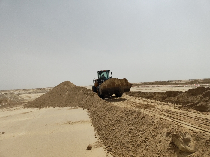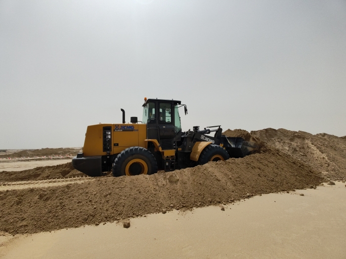 當(dāng)?shù)亟鸸忾W耀的沙漠地帶是極具標(biāo)志性的景觀,數(shù)臺徐工ZL50GN裝載機(jī)正在其中緊張作業(yè)。擔(dān)負(fù)起土方搬運(yùn)、路基平整、材料裝卸等關(guān)鍵任務(wù),在高溫、多塵的惡劣環(huán)境下依然表現(xiàn)出眾,成為不可或缺的重要力量。