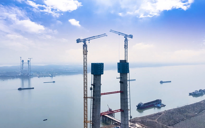 春和景明、碧波蕩漾,巍峨的武漢雙柳長江大橋北主塔正拔地而起,兩臺徐工XGT2230A-100S正高效精準(zhǔn)完成塔柱的拼裝,助力大橋北主塔加速建設(shè)。