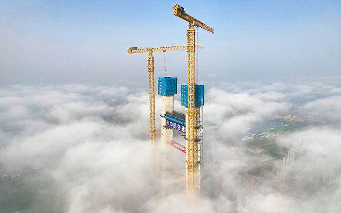目前,兩臺徐工超大塔正在進行大橋北主塔第26節(jié)施工,主塔以平均每周6米的速度迅速“節(jié)節(jié)長高”,高度已達144.5米,高效的施工效率贏得客戶高度稱贊。
